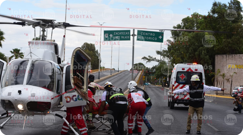 En cuestión de minutos se trasladan paramédicos especialistas en atención médica aerea al punto del accidente para subirlo al helicóptero y trasladarlo a la ciudad, de primer instancia se tuvo conocimiento que llegaría al Hospital 450 sin embargo por la gravedad de las lesiones, se optó por aterrizar en Bulevar Guadiana antes de subir al puente desnivel, ahí ya lo estaban esperando paramédicos de la Coordinación y Cruz Roja Durango para trasladarlo al Seguro Social #1 , donde a su ingreso se le detectó por los golpes agresivo y desorientado por probable traumatismo de cráneo severo, edema en ojo izquierdo y policontundido.