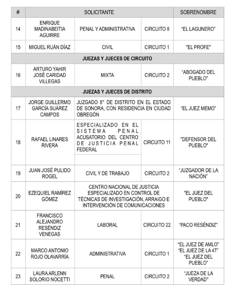 En el caso de candidatos a jueces, también pidieron incluir sus apodos, como Jorge Guillermo García, como “El Juez Memo”; Rafael Linares Rivera, “Defensor del Pueblo”; Ezequiel Ramírez, como “El Juez del Pueblo”; Marco Antonio Rojo, como “El Juez de AMLO” o “El Juez de la 4T”; Laura Arlenn Solorio, como “Juez de la Verdad”, entre otros.